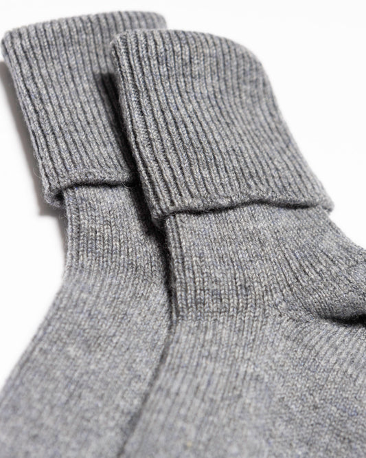 Sometimes the simplest form is the best way to appreciate a material. This sock is spun from exceptionally lofty pure cashmere, they have a soft halo that feels like a cloud around your feet